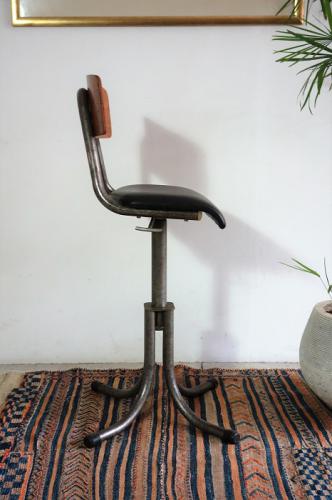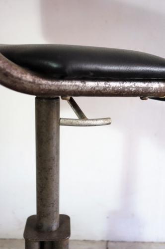 このスツールは、恐らくは工場などで使われていたものと思われ、座面下のレバーで椅子の高さも調整可能です。