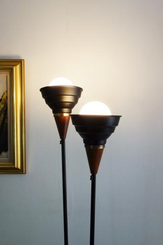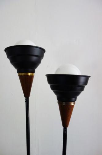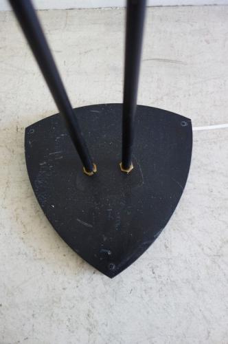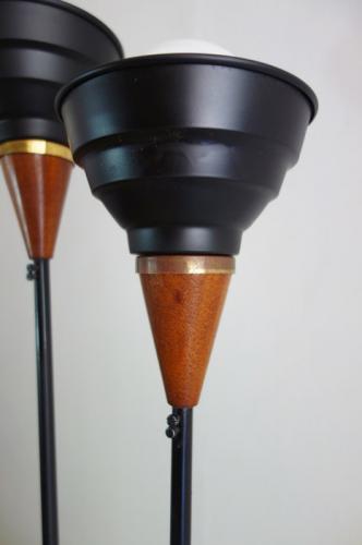 丸みを帯びた三角形の金属の土台と黒い丸パイプの支柱に、真鍮のパーツ、チーク材のシェード台座に