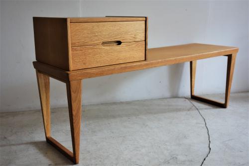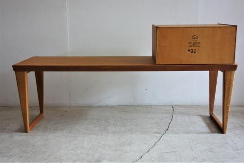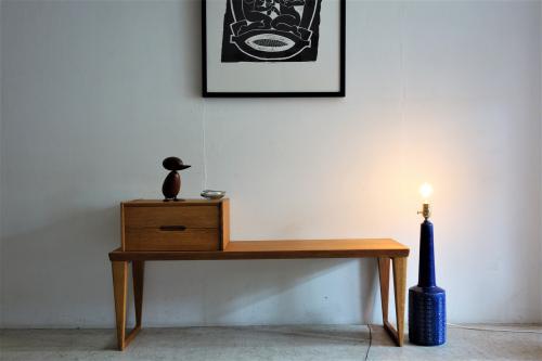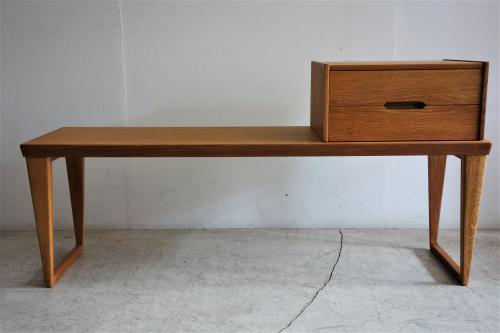 1960年代にデンマークの家具メーカー「Aksel Kjersgaard Odder」社が製造・販売していた「Telephone Bench = 電話台付ベンチ」です。こうしたテレフォンベンチ、日本ではあまり馴染みがないですが、欧米では有名・無名に関わらず、良く目にするポピュラーな家具です。今回の物は、箱物家具に定評のある老舗メーカー「Aksel Kjersgaard Odder」社の物ですが、一説によると、Kai Kristiansenのデザインとの情報もあります。しかし、Aksel Kjersgaard と Kai Kristiansen の関係性や、デザインの提供を証明するものはありません。いずれにしても、AK社らしい、脚の形状と、特徴的な引出しの掘り込みが非常に美しい家具です。