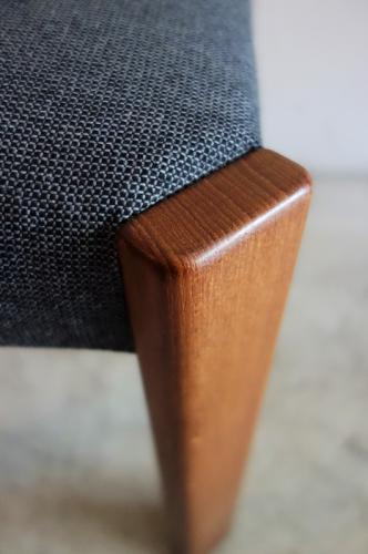 シンプルながら、しっかりとした造りと、贅沢に使われたチーク材の脚が特徴的です。すっきりとしたデザインなので、どのようなスタイルのインテリアにも馴染みます。生地はデンマークの生地メーカー「Kvadrat」社のデッドストックを使用しています。