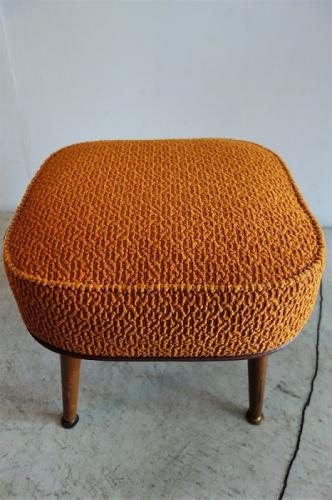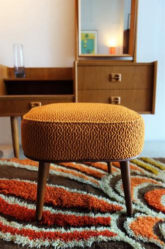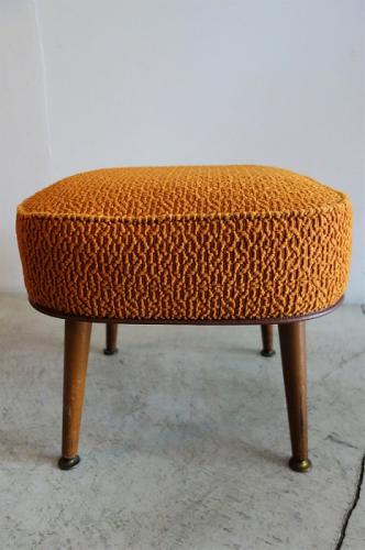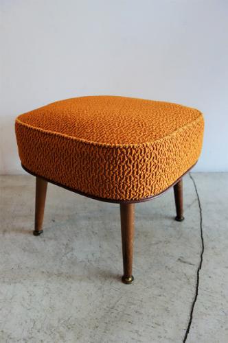 鮮やかなオレンジ色のボア生地が印象的で、敢えて張替えをしていません。内部は多少、ヘタレはあるものの、まだまだ使用できます。いかにも60’sといったデザインのスツールですが、デンマークの家具やポップなモダンスタイルのインテリアとの相性は良いです。