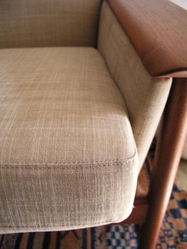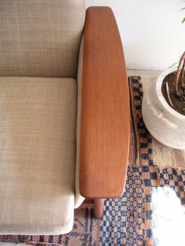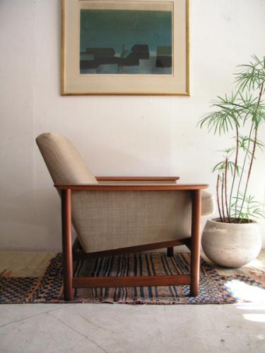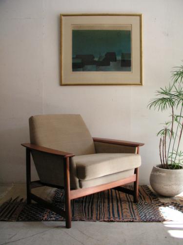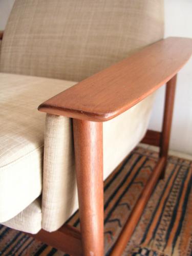 ア-ムと脚に使われている良質なチ-ク材を見ると、デンマーク製のようにも思われますが、詳細は不明です。ローバックの肉厚のクッションと相まって沈み込むような、ゆったりとした座り心地になっています。