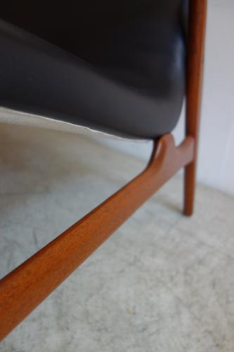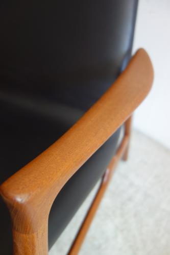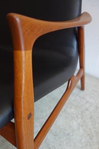 Finn Juhl やN.O.Mollerを思い起こさせるようなチーク材の本体は、細くシャープなデザインながら、美しい曲線とエッジを持っています。シート部分も独特な形状で、背中と座面が一体化し、曲線で繋がっているため、布張りには適していません。今回はデンマークの老舗革メーカー「Sorenen」社の柔らかい黒革で張りました。