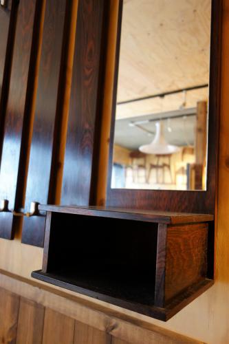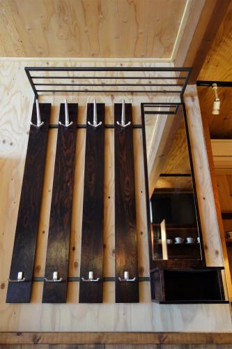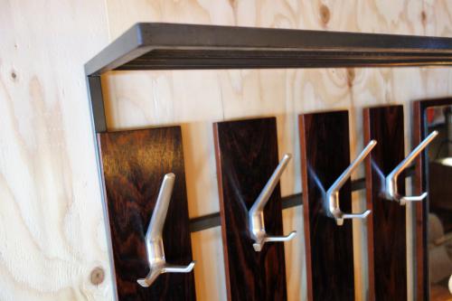 比較的、大型のハンガーラックは、フレームがアイアン、木部はローズウッドの突板になっていて、フックはステンレスでできています。計8個のフックにトップには棚があり、右側の鏡下にはちょっとした小物入れも付いていますので、非常に使い勝手が良いです。