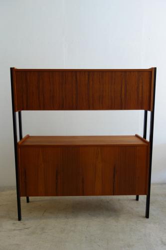 黒い脚が印象的な2段重ねのキャビネットです。スウェーデン製の家具は、デンマークの物に似ているのですが、デンマークには無いデザインと、パーツの組合せやサイズ感が他にはない特徴となっています。このキャビネットは、両端の黒い梯子状の脚に、上下のサイドボードをひっかていて、取り外して輸送することが可能です。全体の素材はチーク材ですが、様々な個所で異なる木材を使用していますので、いろんな表情を見せてくれます。また、背面もチーク材で仕上がっていますので、パーティションのようにお使いいただけます。
