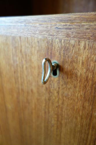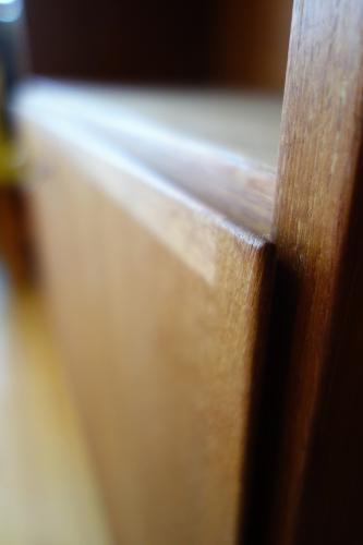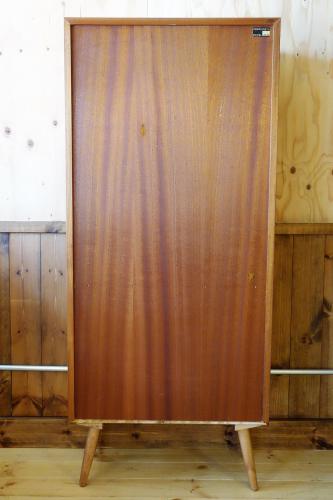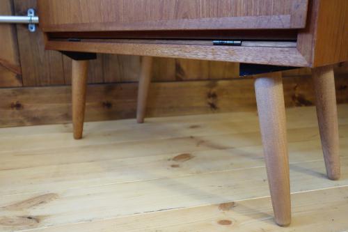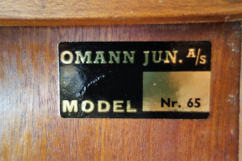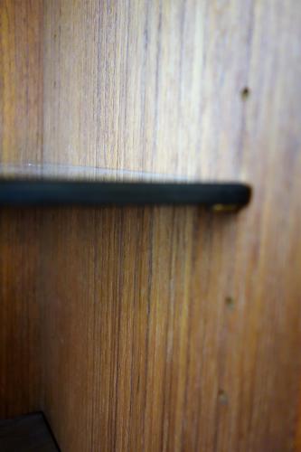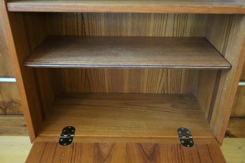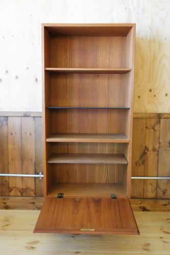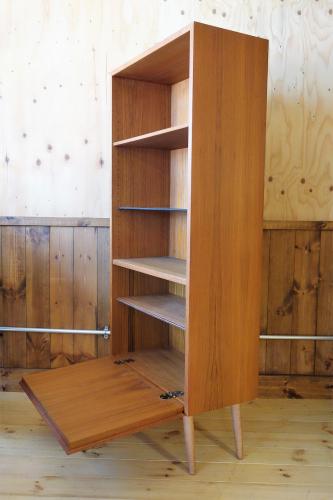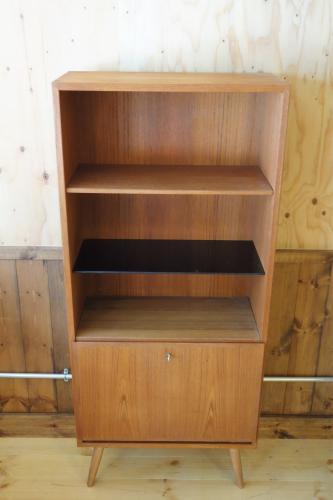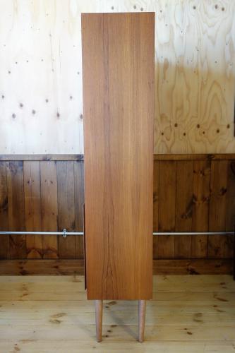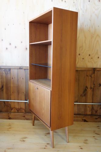 デンマークの家具メーカー「Omann Jun」社の珍しいスタイルのキャビネットです。Omann Jun社は質の良いキャビネットを作ってきたメーカーで、特にサイドボードが有名です。今回の物は縦長のシェルフ型キャビネットになります。下部は手前開きのボックスになっていて、内部には可動式棚板が1枚付きます。上部はシェルフになり、可動式の棚板が2枚付きます。1枚は通常の木材でできた物、もう一枚は黒のガラス板になり、このガラス板はシェルフの一番下に「棚受け」を付けずに敷くことで、濡れたグラスやボトルを置くことを想定されている物です。これにより、輪ジミを気にすることもありません。