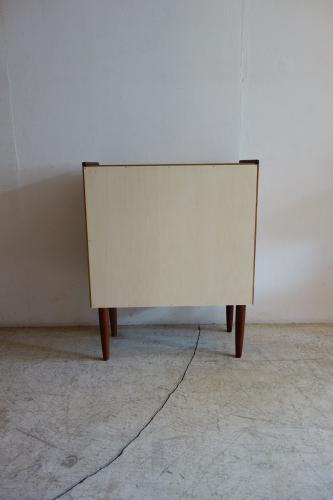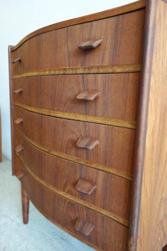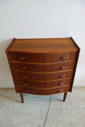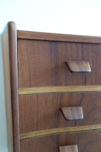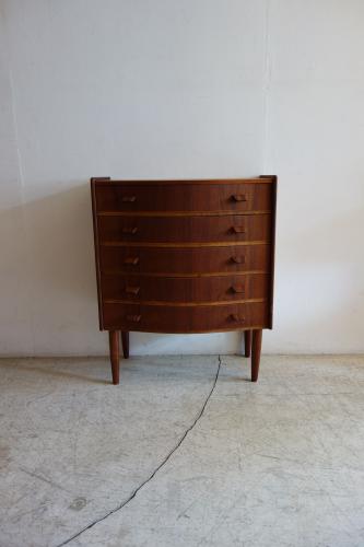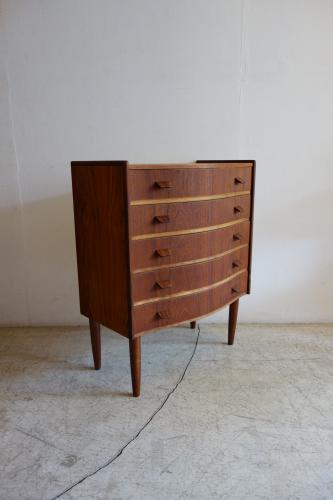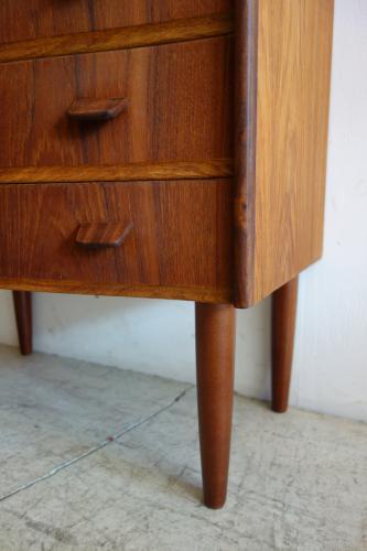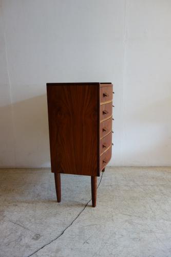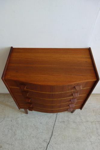 デンマーク以外ではほとんど見ることがない大きさのチェストで、以前は様々なデザイン、大きさの物が沢山ありましたが、今では大幅に数が減少し、それと共に現地での価格も高騰しています。今回の物は、そんなミニチェストでも珍しい5段の抽斗タイプで、さらに前面はカーブが掛かったデザインとなっています。全体は濃い目のチーク材、抽斗のハンドルや小口にはマホガニー、抽斗の下部にはオーク材が使われていて、この家具の表情を豊かにしています。