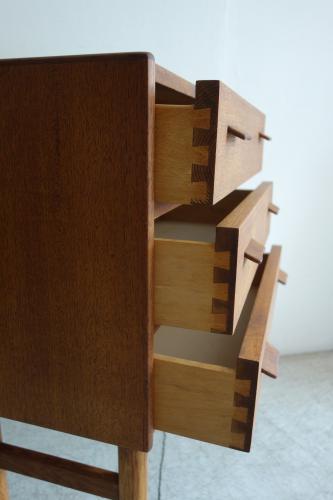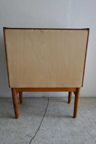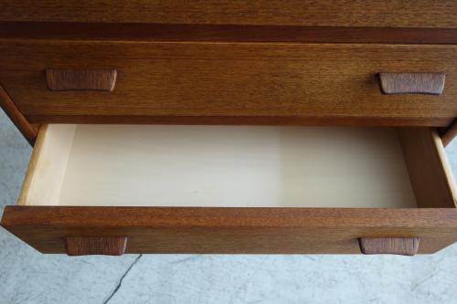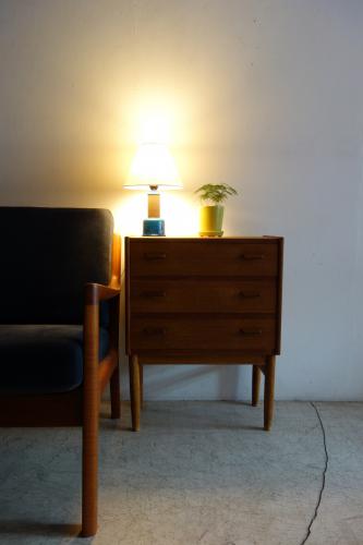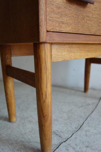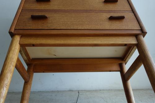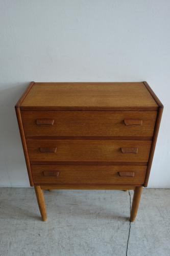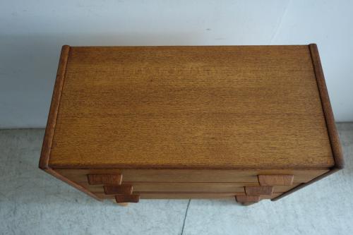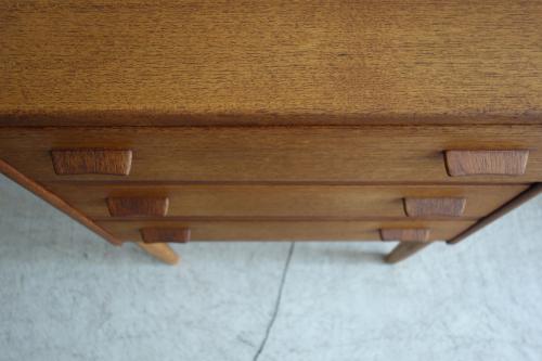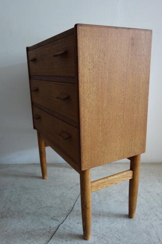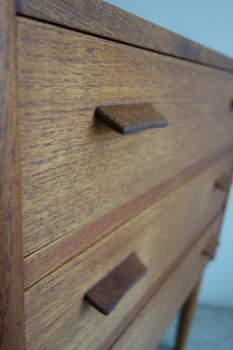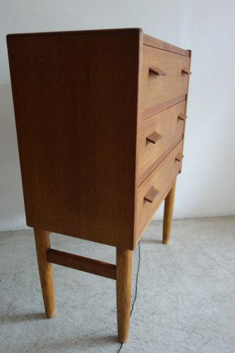 以前はよく見かけた小さなチェストも今では数が減り、価格も高騰しています。今回の物はハンドルの形状が特徴的な非常に北欧らしいデザインとなっています。本体はヴィンテージ感あふれる黄色みの強いチーク材、脚はオーク材となっています。オイルのみで仕上げました。