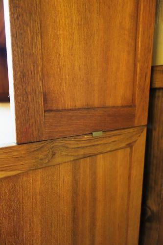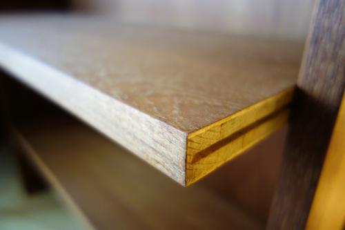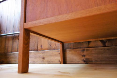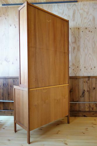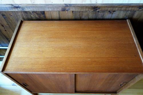 上下に分かれるタイプで、下段は引き戸のボックス、上段は背の高い3段シェルフになっています。シェルフは中2枚が可動式で、収納力も、使い勝手も非常に良いシェルフになっています。素材は全てチーク材で、オイルのみで仕上げています。シンプルなデザインですので、どのようなスタイルのインテリアにもフィットします。上下セパレートで使うことも可能です。