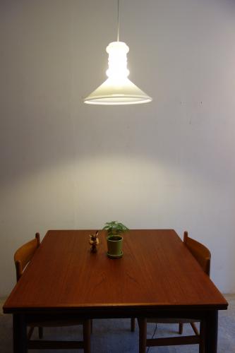 デンマークの老舗ガラスメーカー「Holmegaard」(ホルムガード)のガラスシェードランプです。Holmegaardの作品は、特に1940年代以降からPer Lutkenがデザインを担当するようになって、大きく変わってきました。それまでの「スカンジナビアグラス」とは違った、シンプルでクリアーな色とデザインは、評価も高く、コレクターも多いです。非常に美しい乳白色のガラス作品に、ほのかな明かりが灯れば、より豊かな表情と、穏やかな空間を作り上げます。