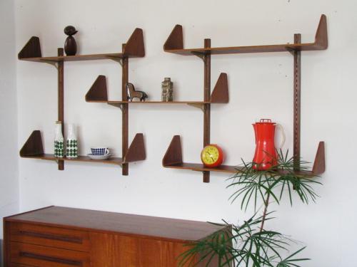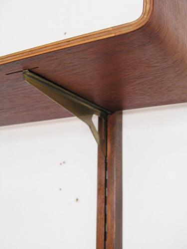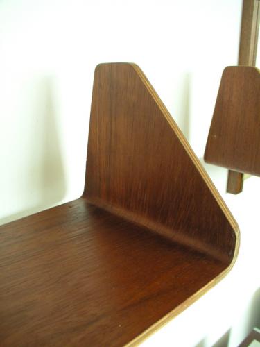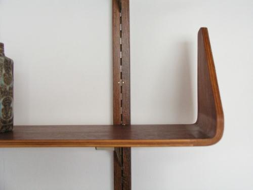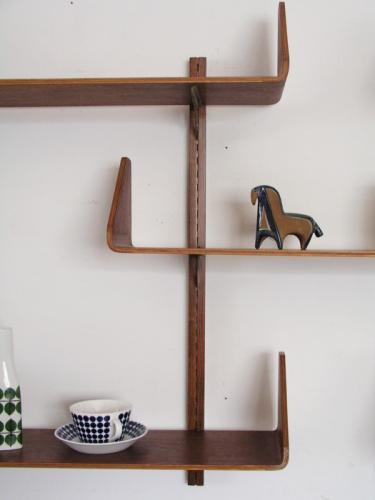 デンマークで買い付けたのですが、プライウッドの造りや棚柱、金属パーツを見ると、スウェーデン家具のようにも思われます。棚板と支柱はチ-クで棚受けが金属。特に目を惹くのが形成合板で作られたチーク材の棚板です。両端が反り上がり、コーナーが丸みを帯びたデザインになっていて、非常に美しいです。
