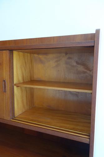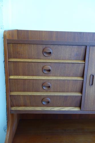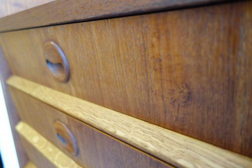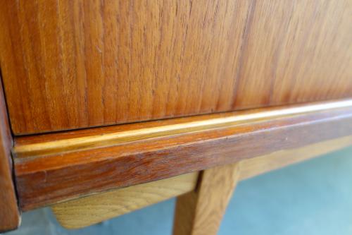 収納力の高いこのキャビネットは、木目の綺麗なチーク材をメインに使用していますが、アクセントで脚の他、引き戸のレールや、抽斗の下部のパーツなど細かいところにオーク材を使用しています。