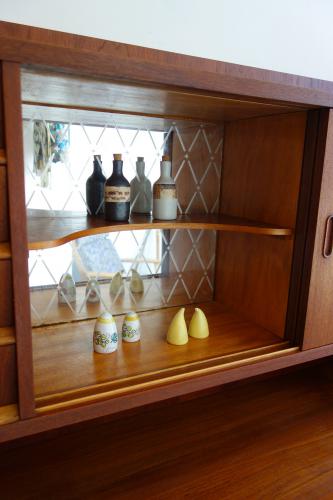 下段引き戸の内部、左側には小さな引き出しが付いているのですが、これはそのままトレイとしても使うことができます。上段抽斗横の引き戸内部は、デンマークに良くある「ボトル入れ」となっていて、背面はガラスになっているので、ボトルの裏側を映し出すことができます。