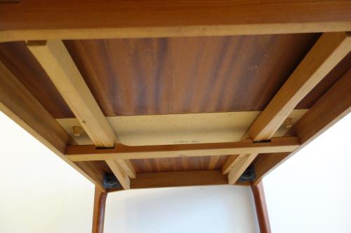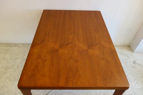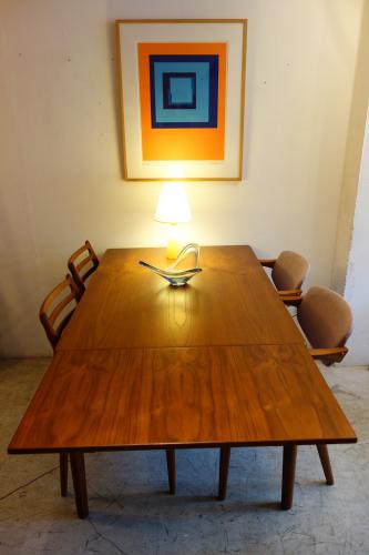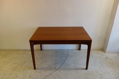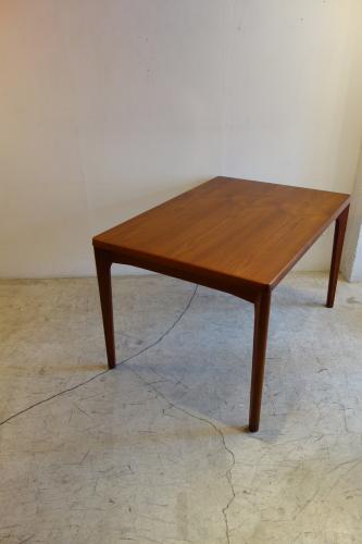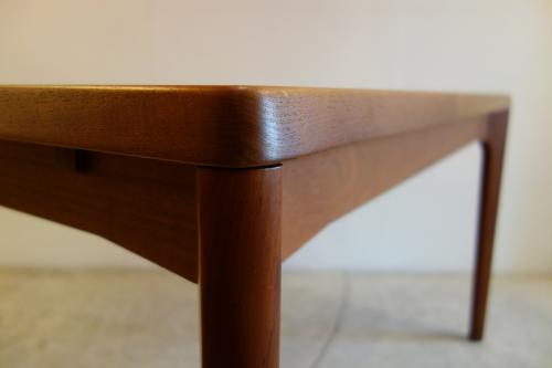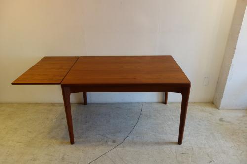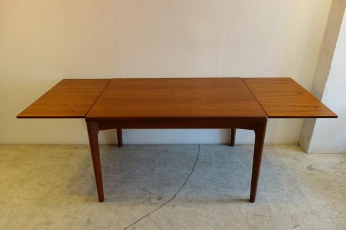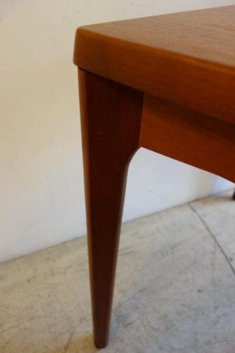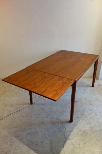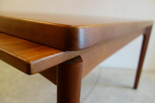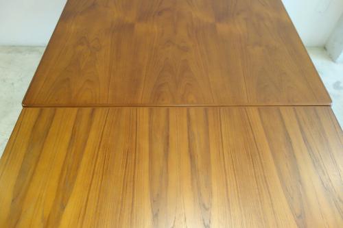 デンマーク製の美しいチーク材ダイニングテーブルです。デザイナーは「Henning Kjaernulf」・・・日本では、ほとんど、知られていないデザイナーですが、主にダイニングセットをデザインしていました。シンプルなデザインですが、非常に良く考えて作られたテーブルが特徴的です。天板端の小口が大きく、エクステンションを覆うことで、見た目の美しさを維持しています。そして、このデザイナーが優れているのは、空間の使い方。外側に対角線上に広がる様に付けられた脚・・・こうすることで、脚と脚の空間を最大限有効活用でき、1200幅のテーブルでも、余裕をもって、2脚の椅子を収めることができます。