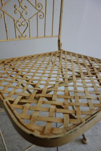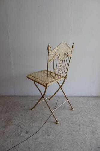 デンマークではあまり見かけない、装飾が施された鉄製のガーデンチェアーです。くすんだ白の塗装が新しい物には無いヴィンテージの風合いを感じます。座面は幅が狭い鉄が編み込まれていて、非常に凝った作りになっています。