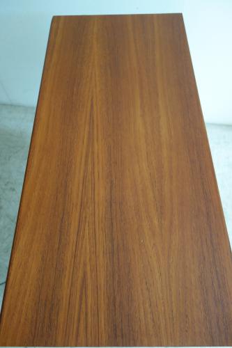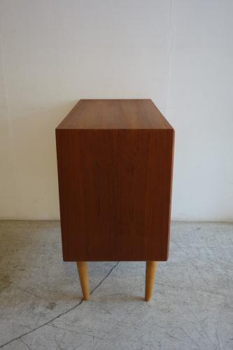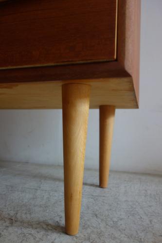 ハンドルは横1本のタイプで、開け閉めも片手で行えます。全体のデザインも木目の使い方もシンプルなので、他の家具との相性も良いです。本体はスウェーデンらしい明るめのチーク材、脚はブナ材となっています。