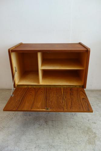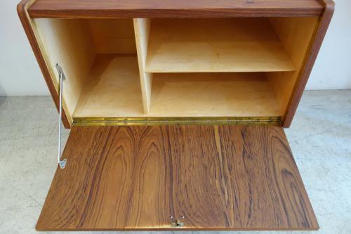 手前開きの「ドロップリーフ型」の扉を開けると、中は真ん中で2つに仕切られ、片側には棚板が1段付きます。おそらく、元々はレコードなどを入れるAVラックとして使用されていたのではないかと思われます。