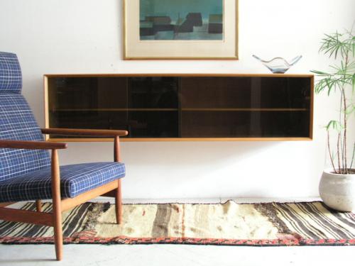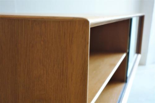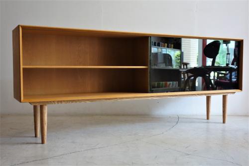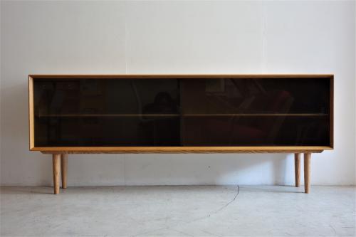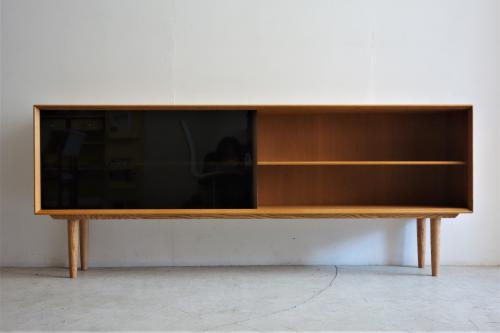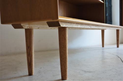 デンマーク製の非常に美しいガラス戸+オーク材のキャビネットです。現在もデンマークにある「A/S Skovby Møbelfabrik」社製の家具なのですが、「組合せ家具」の一部で、様々な組み合わせ、単体で使用するものだと思われます。2段重ねの上部であったり、直接、壁に取り付ける「Wall Unit」としてや、脚を取り付けてローボードとして使用したりと多様な家具となっています。今回の物は、背面に引っ掛けパーツが付いていましたので、壁付け用として販売されたものだと思われます。脚は当店にてオーク材で新しく制作したものを取り付けています。取り外しは簡単ですので、壁掛け・床置き両方で使用可能です。
