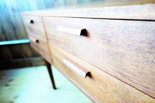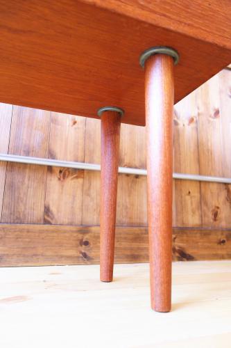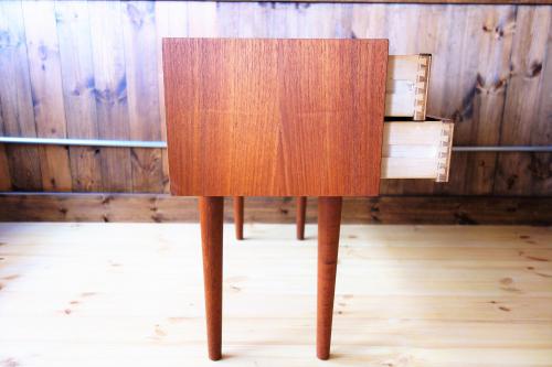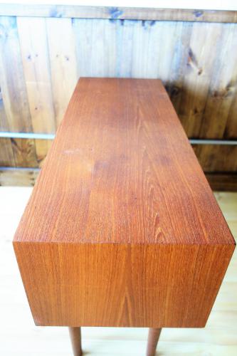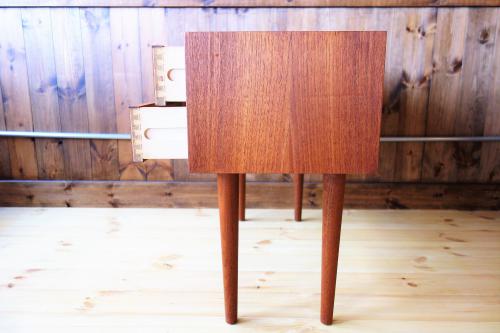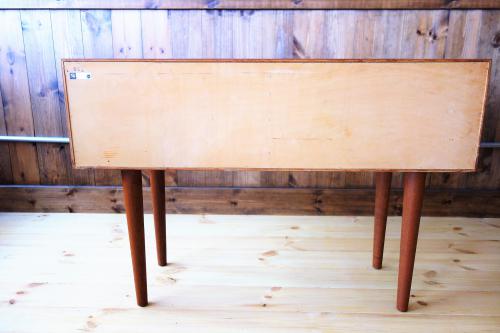 カイ・クリスチャンセンと言えば「椅子」のイメージが強く、個性的なデザインが多いのですが、意外にもデスクや箱物も数多く作っています。はっきりとしたデータが残っていないので、「彼の作品」かどうか、判断が難しい場合が多いです。椅子は形状で判断し易いですが、箱物はメーカー刻印やハンドルで判断するしかないので、難しいです。今回の物は、比較的、多く作られたものですが、ハンドルが「丸みを帯びた」よく目にするタイプとは違い、シンプルな「角」型になっています。いずれにしても、造りもチーク突板の質・模様も非常に美しいです。