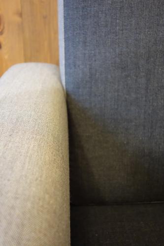 クッションはデンマークのテキスタイルメーカー「Kvadrat」社の「Remix」で張り替えました。2色のグレーで、濃淡のコントラストが非常に美しく、組合せによって表情が変わります。