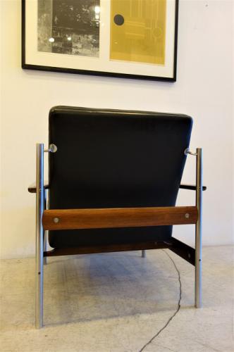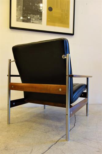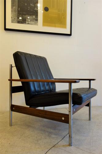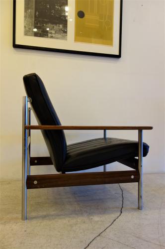 ノルウェーのデザイナー"Sven Ivar Dysthe"の1人掛けソファ"No.1001"です。ノルウェーのモダンデザインと言えば、ファルコンチェアーの"Sigurd Resell"や、シエスタの" Ingmar Relling "が有名で、いづれも、Alvar Aaltoを思い起こさせるような曲線を形成合板で行った作品が目立ちますが、このDystheの作品は、どれも奇抜・・・イタリアのポストモダン的な発泡ウレタンを使った作品が多いです。その中でも、彼の初期の作品が、この「No.1011」シリーズの椅子です。ソファの他にダイニングチェアーもあるのですが、基本構造は同じで、クロームメッキの丸パイプにローズウッドの無垢材を使用したアームと貫き、そこを留めるパーツは丸いステンレス・・・さらに本革のシート。どことなく、デンマークのPoul Kjærholmnのデザインに近いかなと・・・この2人は同世代でモダンデザインの第3世代を支えてきた重要なデザイナーの1人です。ちなみに、Dystheの奥様はFinn Juhlの元でデザインを学んだそうです。