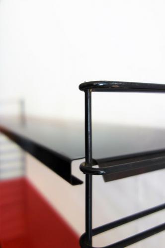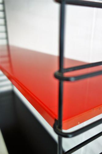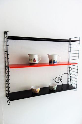 1958年にAdriaan Dekker によってデザインされたシェルフユニットです。ワイヤーの棚受けとカラフルなメタルの棚板が特徴で、当時はユトレヒト出身のアーティスト「Mondriaan」カラー(赤・青・黄色)が特に流行っていたようです。当店では以前、チーク材の棚板も入荷したことがあったのですが、オリジナルの板かどうかは不明です・・・数年前に生産を再開したようですが、何とも言えない風合いはヴィンテージならではです。ポップなデザインですので、北欧家具やモダン・鉄物・ブルックリンスタイルのインテリアにも良く合い、お部屋のアクセントになりそうです。