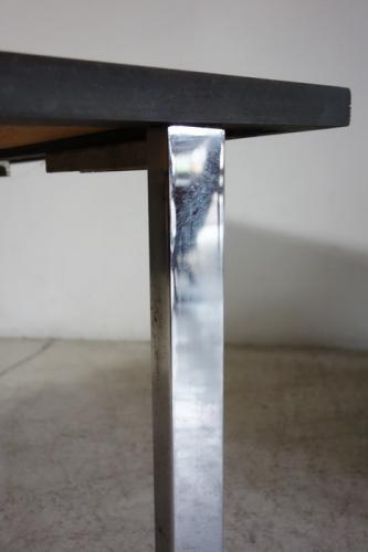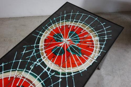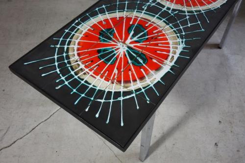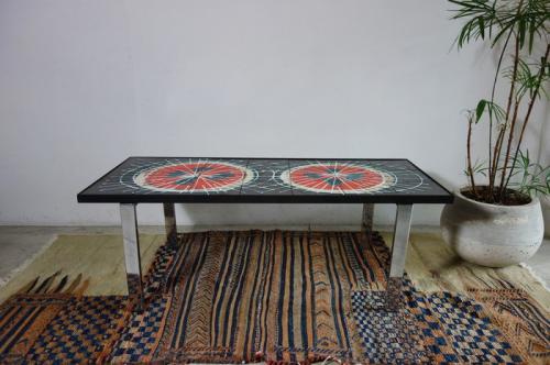 黒いタイルに幾何学模様の赤い円が2つ描かれていて、天板にはデザイナ- "J.Belati"のサインも書かれています。脚はクロームメッキされた鉄、エッジは黒の鉄がモザイクタイルを額のように囲っています。デンマークのスタイルのセンターテーブルと違い、サイズが小振りで、高さが40cmを切るデザインとなっています。北欧のモダンデザイン、木工家具はもちろん、Brooklyn Styleのインテリアとも、相性が良いです。