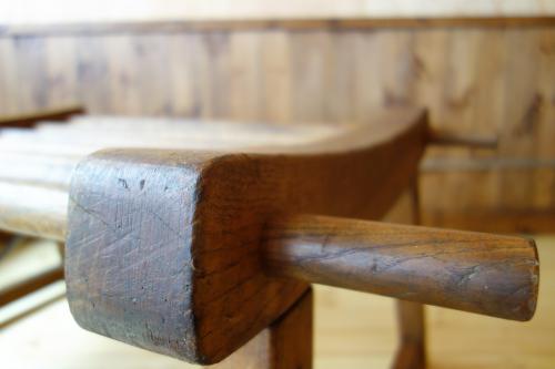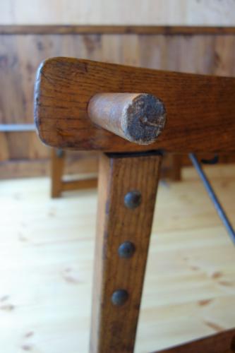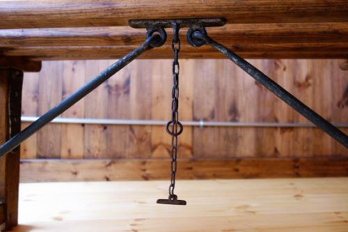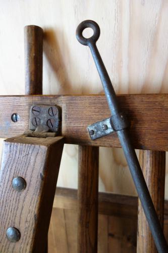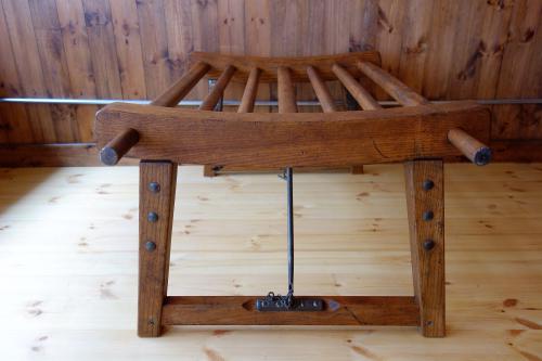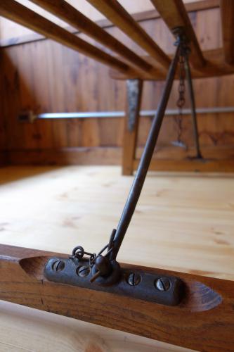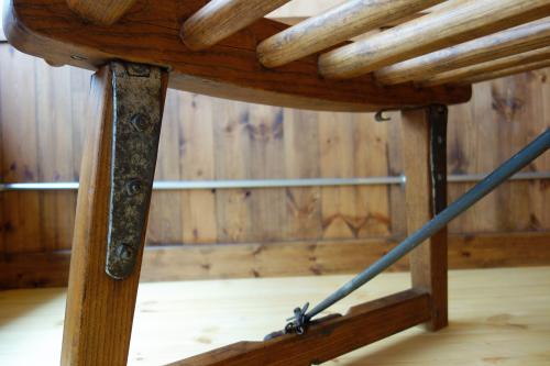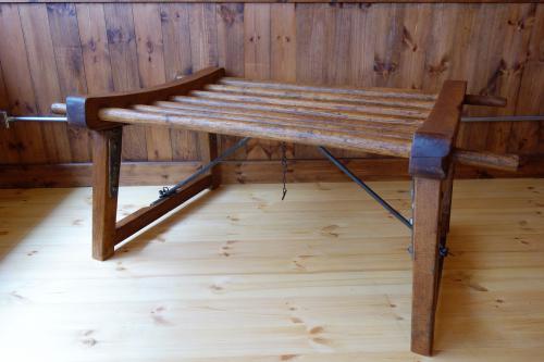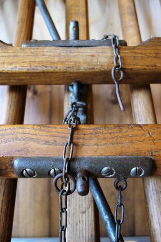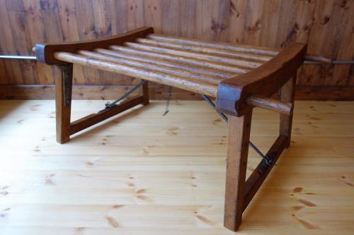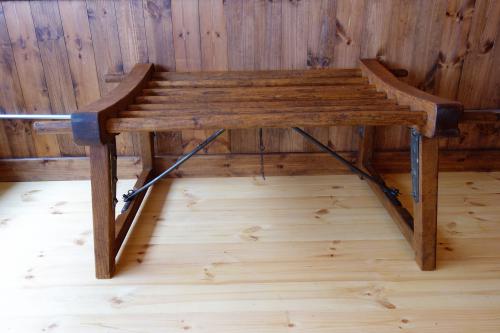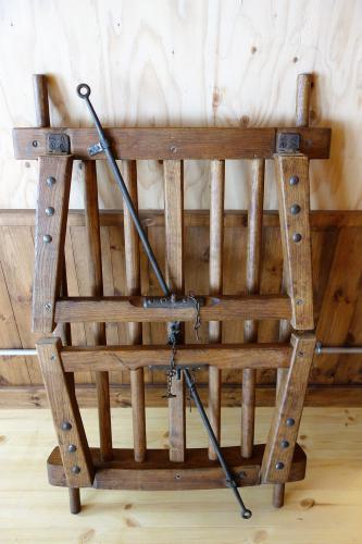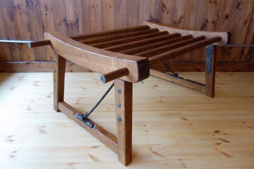 恐らくは農工具(干し草などを運搬する)と思われます。両端に持ち手があり、ずっしりとした脚を金具とチェーンで固定するようになっています。