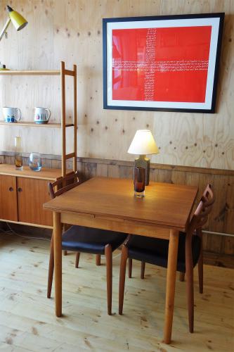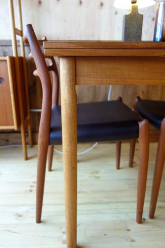 天板と幕板はチーク突板で、脚はチーク無垢材を使用しています。デンマークでは、最もオーソドックなデザインのテーブルですので、どのようなスタイルの椅子、インテリアにもフィットします。色合いも濃くもなく、薄くもないので、ダイニングチェアーの色や素材、ファブリックや革の色も選びやすいです。