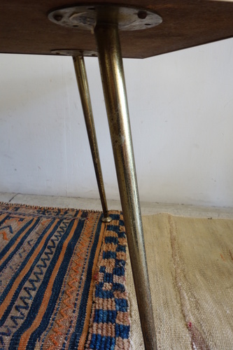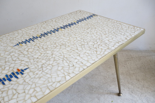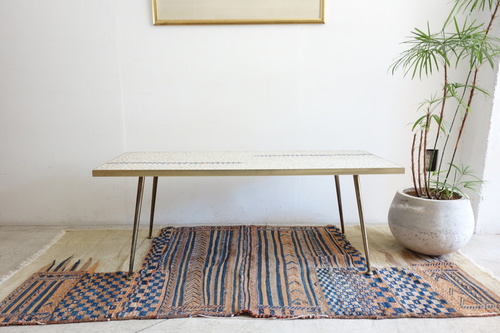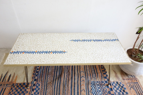 天板全体がタイルが貼られたモダン系のテーブルは、北欧では見かけm無いタイプです。特にオランダ、ベルギーの物は金属との組合せが多いように思われます。今回の物は、真鍮の枠組みに白いタイルがキャンパスのようで、モザイク状に施された青いタイルとその中にアクセントにオレンジ色のタイルが組み合わされています。脚部も真鍮で、細い脚が斜めに伸び、先端が丸く靴を履いているような形状になっているのが特徴的です。