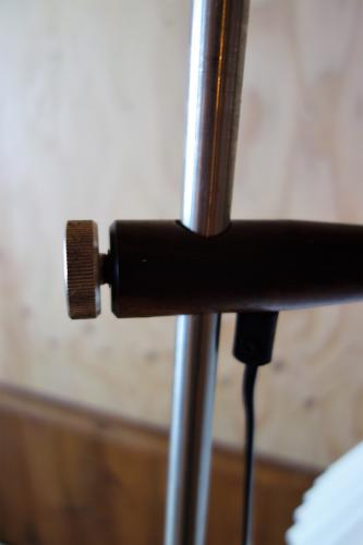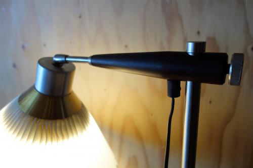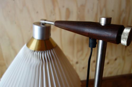 ベースと支柱はステンレス、シェード受けは真鍮メッキ、所々に使われている木材はローズウッドになります。そして、Le Klimtのデザイナー「Tage Klint」の特徴的なシェードが様々な角度に調整ができ、暖かな灯りで、お部屋の雰囲気を変えてくれます。もちろん、シェードの高さ調整もできますので、手元を明るく照らすこともできます。