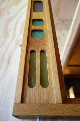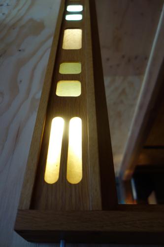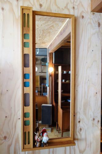 何と言っても左側にモザイクのように施されたステンドグラスが特徴的です。内部には3つの電球が取り付けられ、明りを灯すと何とも言えない輝きを作り出します。ウォールランプとしての役割も十分備えています。また、ミラー下部には、ちょっとした小物を置く「棚」がありますので、お気に入りの小物を飾ることもできます。