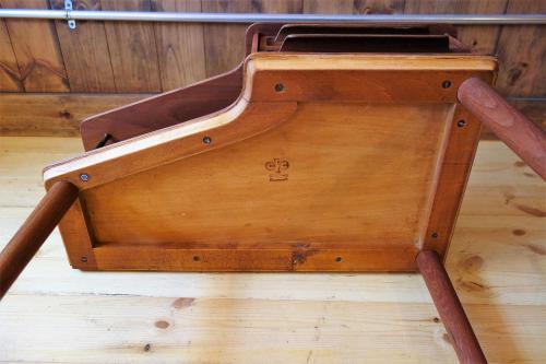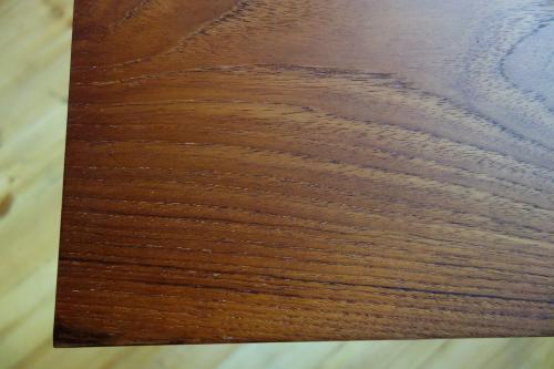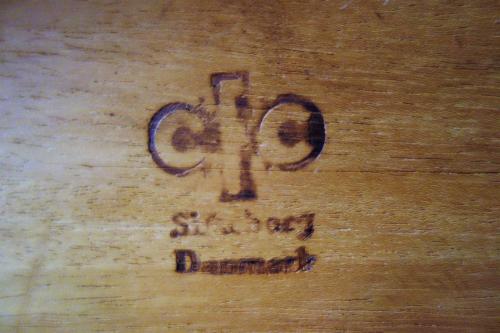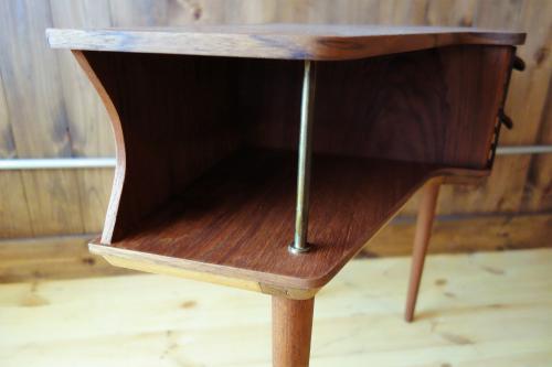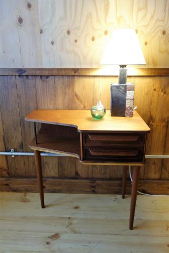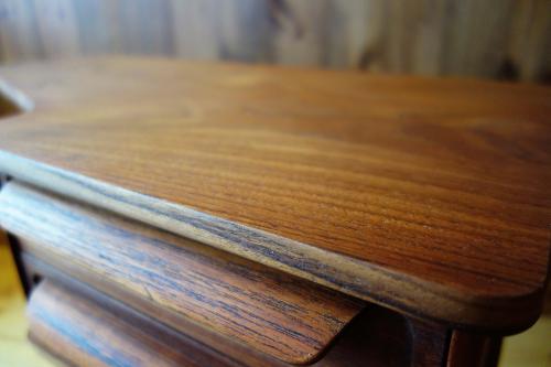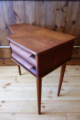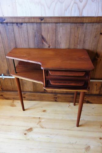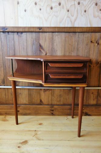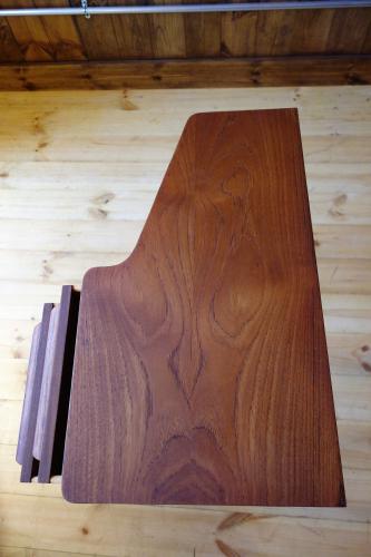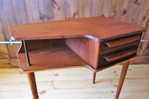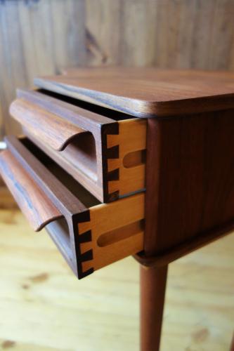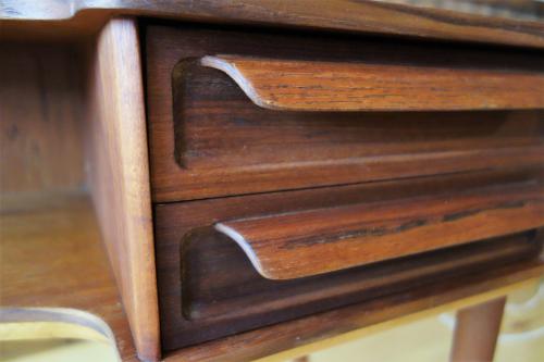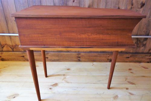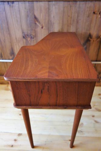 ハンドルの形状から、デンマークのデザイナー"Johannes Anderesen"のデザインによるものと思われます。その特徴的なハンドルが付いた抽斗は、正面がチーク無垢材を削り出したもので、カーブしたハンドルとのバランスが非常に美しいです。また、ピアノのような独特のデザインを支えている絶妙なバランスの細い3本脚や壁付けに設置する家具なのに、背面までも美しくデザインされていることからも、この小さな家具の質の良さを窺うことができます。