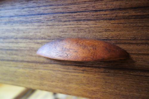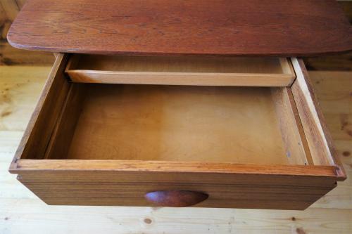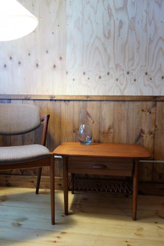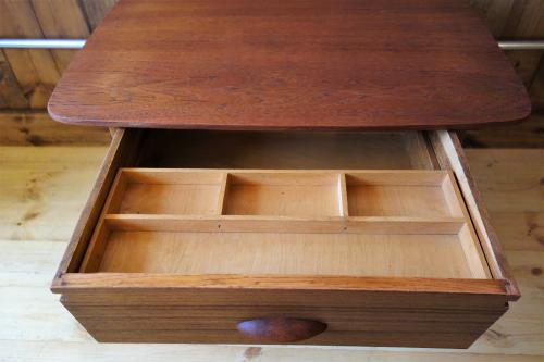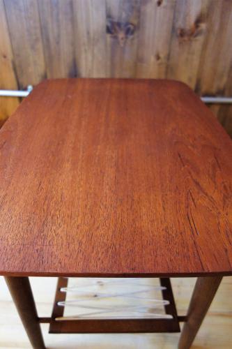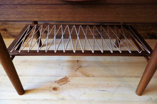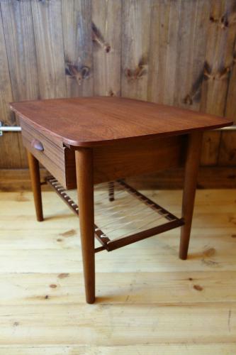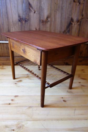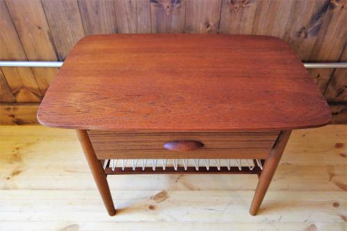 サイドテーブルに大き目の抽斗が付くのは珍しいので、恐らくはミシンテーブルとして使われていたものかと思います。抽斗内部には小分けされたトレイ状の内部抽斗が付き、非常に使い勝手が良いです。テーブル2段目は70年代の北欧やオランダ、イギリス家具に多く見られたビニール状の素材で編まれた棚が付いています。デンマークでは珍しい高さ40cm台のテーブルは、ソファサイドに丁度良いサイズ感になっています。