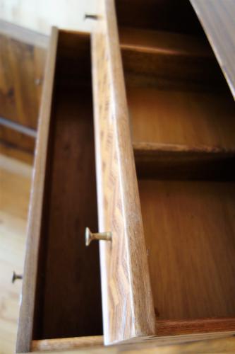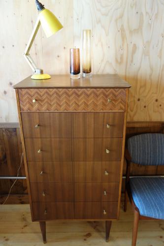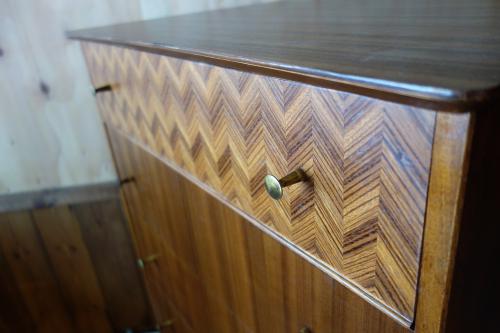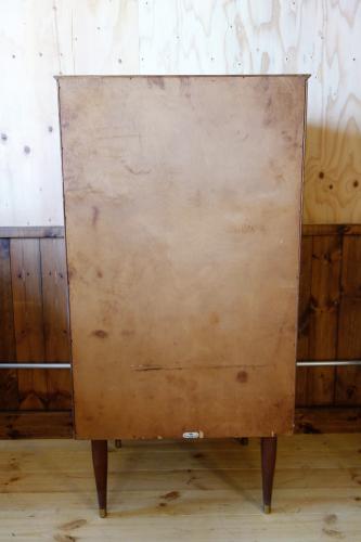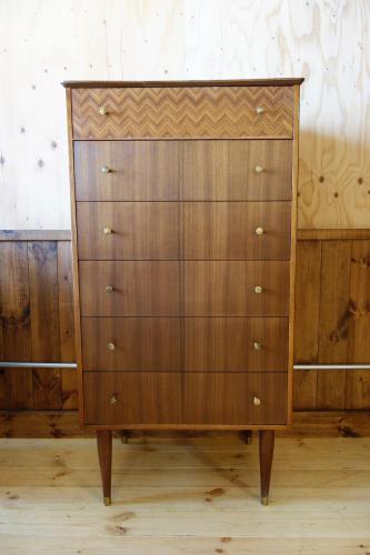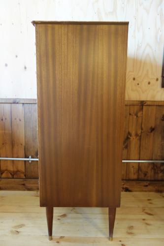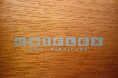 「Uniflex」は、イギリスモダンデザイン家具の草分け的家具メーカーで、1950年代より様々なスタイルのモダン家具を作っていました。その前衛的なデザインは、G-Planなど多くの家具メーカーに影響を与えています。その片鱗が、このチェストにも多く見られます。いかにもイギリスらしいデザインのチェストは、最上部の抽斗だけ「ヘリンボーン柄」の突板が使われ、天板の形も全面が中心に向かってカーブしています。その特徴的な抽斗のハンドルや脚先には真鍮が使われています。デンマークなどの北欧では、まず見ることは無いデザインになっています。北欧はもちろん、インダストリアル系やアメリカンスタイル、オランダモダンの家具と合わせてもマッチします。