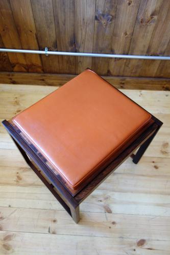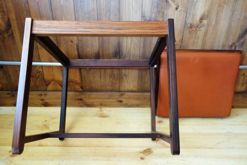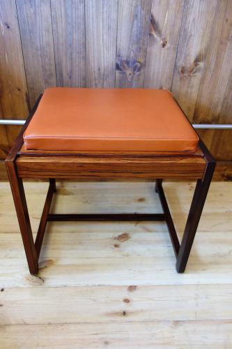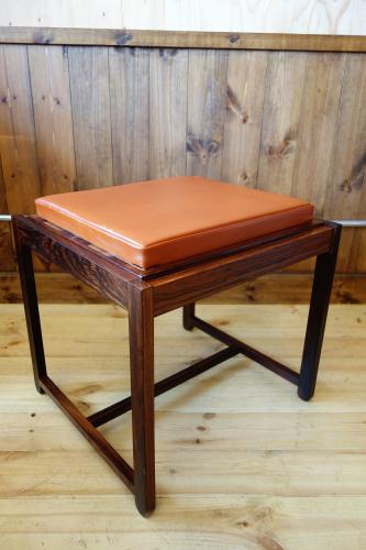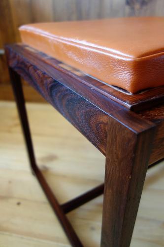 ローズウッドの独特な木目が美しいサイドテーブルは、天板を裏返すとシートハイが高めなスツールになるという優れものです。ベースの部分の造りがしっかりとしていて、さすがは数々の木工製品を手掛けている「O.D Mobler」といった感じです。スツール部分は当時のままの本革ですが、まだまだ十分に使えます。ご希望により、別途、張替えもいたします。