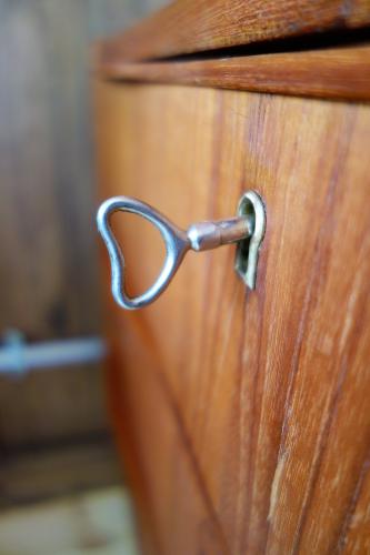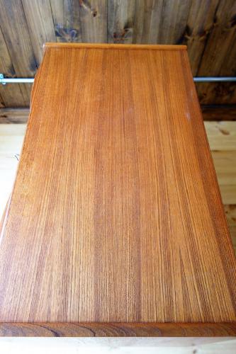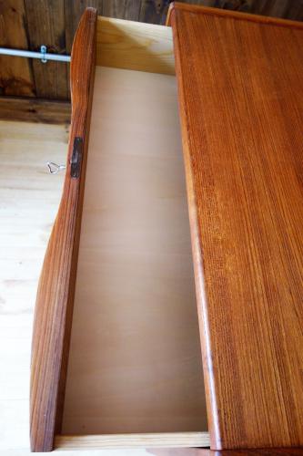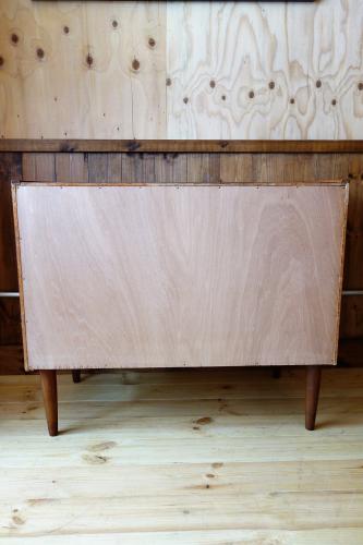 今回の物は、本体がチーク突板、小口と取っ手はチーク無垢材、脚はアフリカンチーク(アフロモジア)無垢材になっています。背面と抽斗底板は新品の合板に交換済みです。