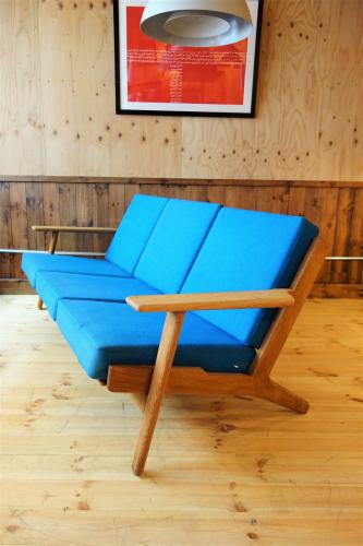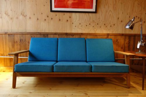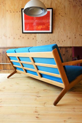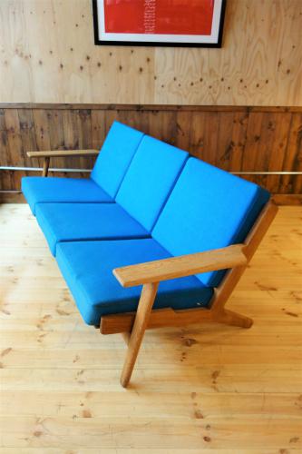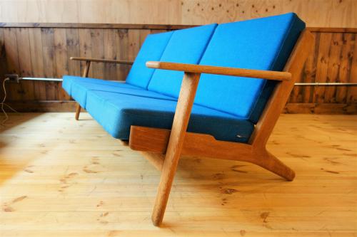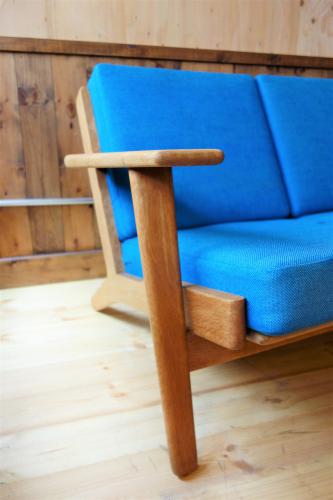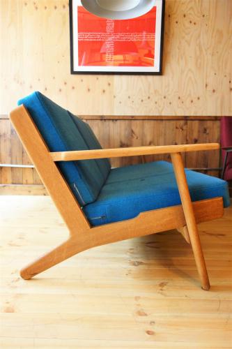 "Meister" Hans Wegner/ハンス・ウェグナーが1953年にデザインし、GETAMA社より販売されたソファです。60年を経てなお、人気があり、現在でも製造・販売されています。あまりにも有名になったため「ジェネリック」という名のコピー製品も多く作られていますが、絶対に真似ができないのが、後ろ脚の角度と構造です。座面の支えがそのまま延長して後ろ脚になり、その滑らかな曲線上に背もたれが絶妙な角度で取り付けてあります。この背と後ろ脚、内部でホゾが複雑に組まれているため、緩んでも外れることはありません。