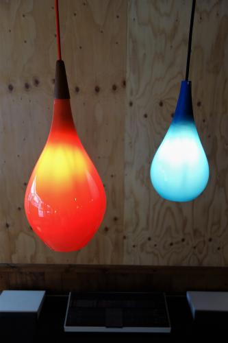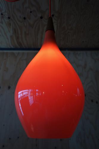 今回の物は、外も内側も「赤」という珍しいタイプになります。灯りを点けると、より、そのガラスの色の美しさが分かります。また、形も「Teardrop」型で、Holmegaardの照明では、非常に珍しい形になります。