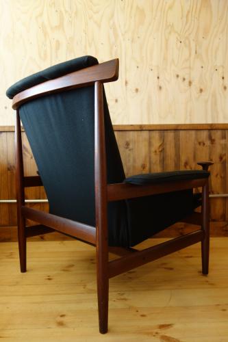 1962年にFrance & Søn社によって製造されたこの大ぶりなラウンジチェアーは"Model #152 Bwana Chair"として販売されました。諸説あるようですが、アフリカのブワナ族の長の椅子からインスパイアされてデザインされたもので、大きな背もたれと、丸いハンドルが特徴的で「王」をイメージさせるようなフォルムになっています。当然、座り心地も、非常に良く、包み込まれるような感覚です。シート高が40cmを切った低さも、そう感じさせる一因かと思います。