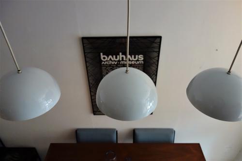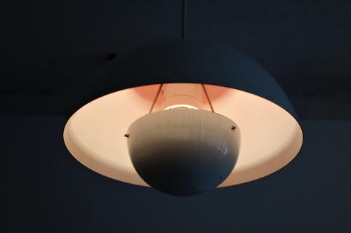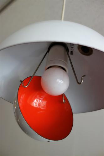 見た目がシャープなのは、2つの半円のサイズが、後期の物とは明らかに違っているからなのです。これは、初期型のスケールだと、通常の電球が入らないということによるものだと思いますが、詳細は不明です。初期型は上部のシェードと下部のシェードの距離が短く「ボール球」という丸い小さな電球しか入らないです。その分、上下のシェードのバランスが絶妙で、見た目がすっきりとシャープな印象を与えてくれます。下部のシェードは内側が赤く、灯りを点けると、ほんのりと赤い灯りがもれて、パントンの世界を演出してくれます。