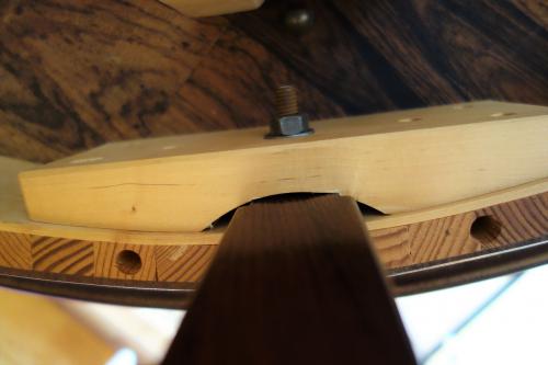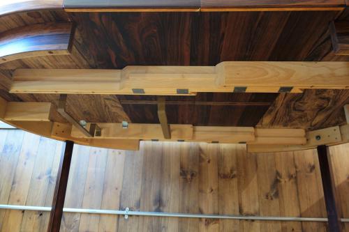 直径110㎝と小振りなラウンドテーブルは、非常に美しいローズウッドの板目突板の天板に、厚めの小口には木目を際立たせるような板目挽き板が使われています。脚は細身で濃い目の無垢材が使われ、全体を引き締めています。