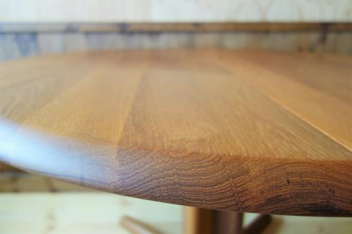 カフェテーブルのような小さなテーブルで、これまで扱ってきた円形では見たことが無い、一番小さなものになります。素材はタイ産チーク独特の赤味と美しい板目で、6枚接ぎの無垢材です。小さいながら、50㎝のエクステンションボードが2枚付きますので、最大2mを超えてきますので、6人は座ることができます。