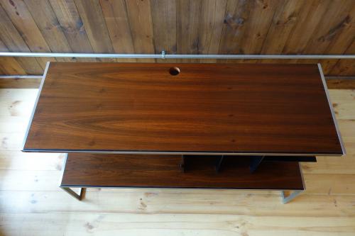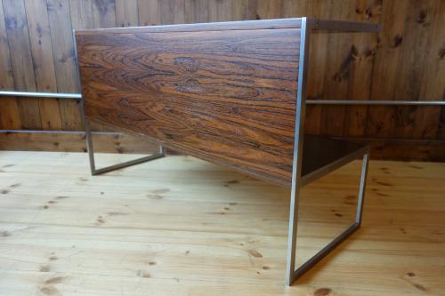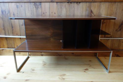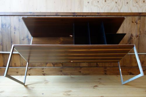 シンプルながら機能的で、重いステレオも、十分に支える強固な造りになっています。Jacob Jensenらしいデザインで、ヘアライン仕上げのステンレス脚とエッジに黒いブラジリアンローズウッドの本体が見事な美しさを演出しています。