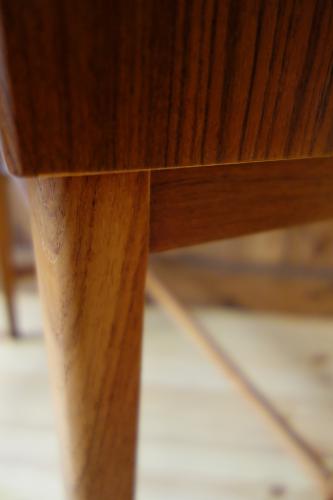今回の物は、本体がチーク突板、脚はチーク無垢材になっています。背面の板もサンディング後、オイルで仕上げています。抽斗底板は新品のシナ合板に交換済みです。