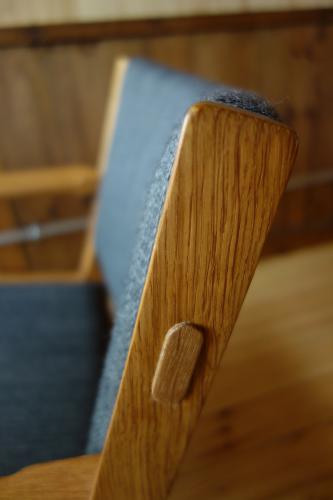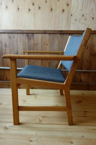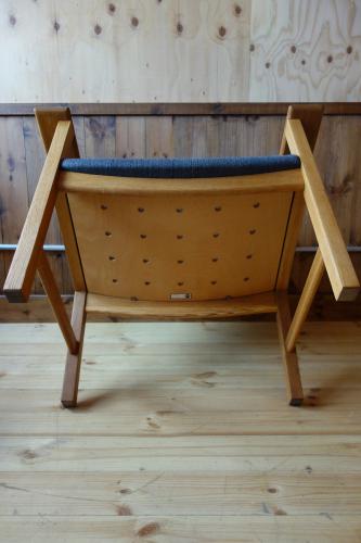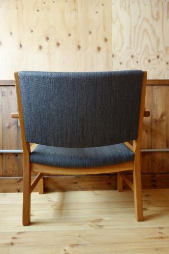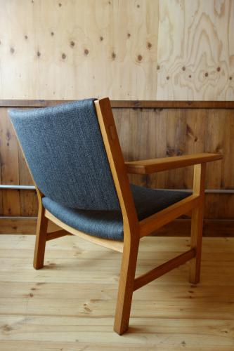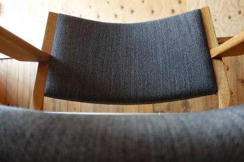 シンプルながら、端々にWegnerらしさと、彼の職人としてのこだわり、造りの良さが見て取れる椅子になっています。そして何より、その座り心地。前期のWegnerのラウンジチェアーやソファは、安楽性を重視し、後方に向かって、傾斜が掛かっている物が多いのですが、この椅子は、あまり傾斜が無いのに座り易い・・・これは絶妙な座面と背中の傾斜とカーブによるものだと思います。更に特徴的なのが、立ち上り易さ。実はこの椅子、彼の父親の為にデザインしたものなので、特に「立ち上がり易さ」にこだわった椅子なのです。今回の物は、モーエンセンの椅子を数多く手掛ける「Fredericia」で作られたものですが、元々は老舗木工所「Johannes Hansen」で作られていました。