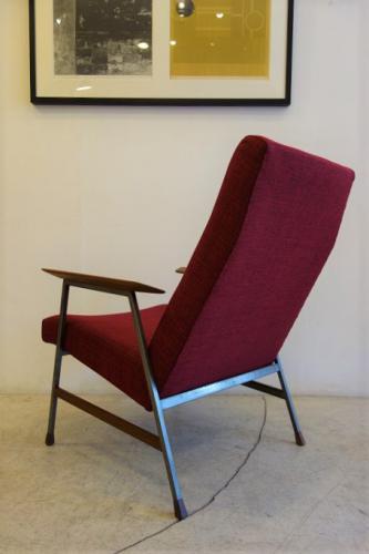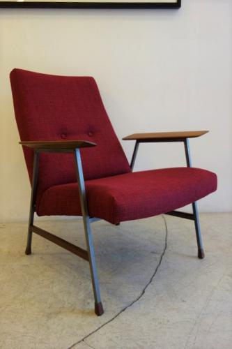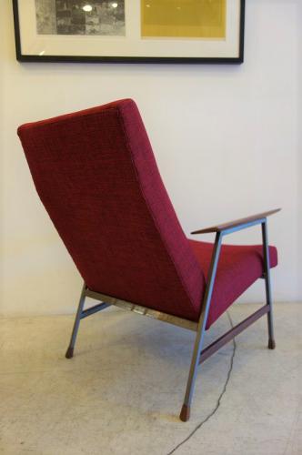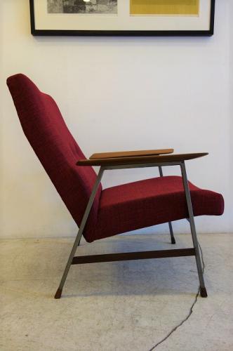 北欧っぽさがあるのに、北欧には無いデザイン=オランダモダンデザインです。金属と木材の融合がオランダデザインの特徴の一つなのですが、デンマークのヴィンテージでは、あまり使わないウォールナットをアーム、脚先、貫きに使い、細目の鉄の角パイプに組み合わせているところが、まさにオランダデザイン。かなり内側に傾斜して取り付けられたアームを見て分かるように、安楽性を重視したデザインになっています。