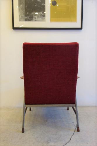 椅子について・・・シート内部は堅めのコイルスプリングが入っていて、周りを上質なウレタン(ラバリー)で覆い、オランダ製の赤いファブリックで張り替えました。