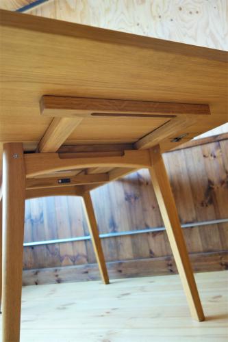素材は、天板・脚ともにオークの無垢材で、ラッカー仕上げになっています。エクステンションは1枚のみとなります。