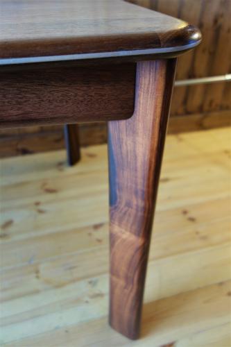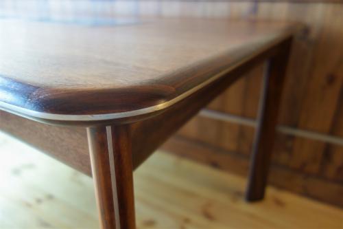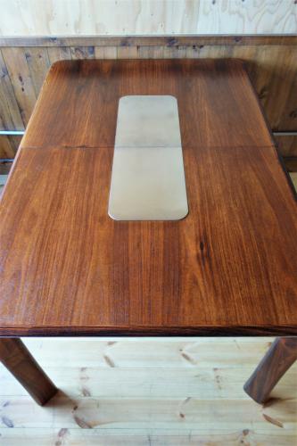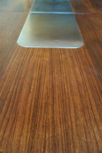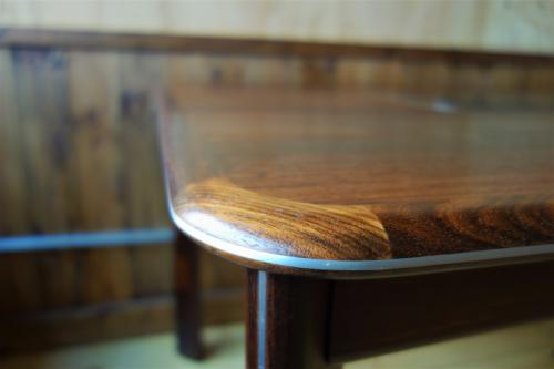 まず目を見張るのが、ローズウッドと金属の組み合わせ。天板中央には大きなプレートがあり、熱いものや、濡れたものも置けるようになっています。更に、小口と脚にも金属(恐らくアルミニューム)がはめ込まれていて、非常に美しいデザインになっています。また、脚と小口の絶妙なカーブ、脚の女性的な曲線は、ローズウッド+金属という、重くなりがちな印象を、上手くまとめています。